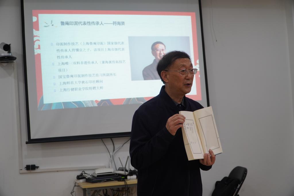 活动中,学院大师工作室特聘技能大师、国宝鲁庵印泥制作代表性传承人符海贤从亲自制作的系列藏印票说起,引出小小一枚藏印票集印泥、传拓、篆刻、夹宣、纸品五项非遗技艺于一身的深厚文化内涵,令学员们为之不住惊叹。讲到一本海派书画名家荟萃的印谱,被海内外收藏家争相抢购,印泥制作与传拓艺术成为其收藏价值保障的故事,让学员们对非遗技艺蕴含的精诚匠心有了深刻的印象。