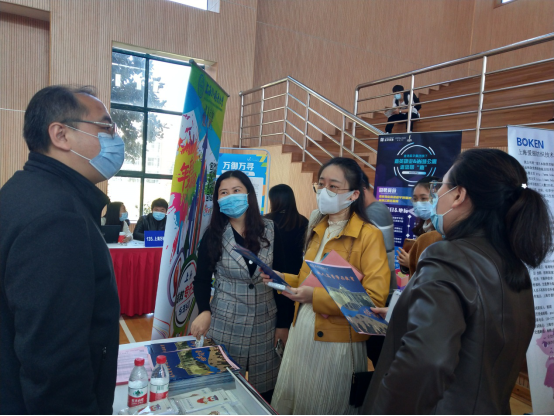 11月13日下午,商务外语系主任曾恬、党支部书记杨晓霞和应用英语、少儿英语、应用德语、法语、日语专业负责人、系部任课教师到校招聘会现场观摩调研。