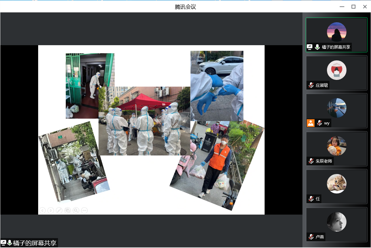 最后,信机系教学事务秘书柏婷老师分享了自己的抗疫志愿者故事。3月27日,柏婷老师在线完成党员社区双报到。3月29日,柏婷老师接到了街道党支部的电话,加入街道抗疫临时党支部,成为了一名党员抗疫志愿者。柏婷老师主要负责所在楼栋的志愿服务工作,包括核酸检测秩序的维护,抗原、保障物资的发放,给有需要的人员配药以及楼栋的消杀等工作。柏婷老师通过一个个小故事,号召所有老师关心楼里的孤老,关心小区的流浪小动物等。“我个人力量有限,但是我想尽自己所能,传递这份关怀和温暖,众人拾柴火焰高,希望上海疫情早日得到控制,我们在校园再相聚。”