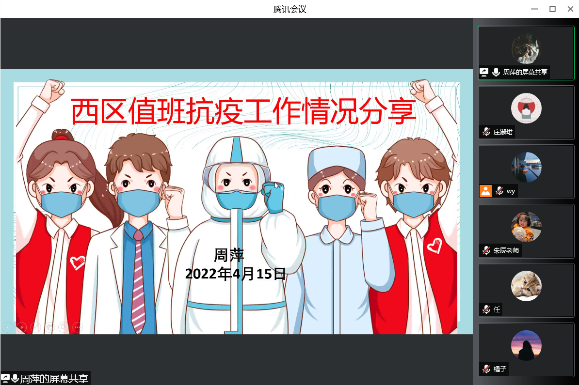 会上,辅导员周萍老师首先介绍了自己在学校西区一线抗疫工作内容,包括每天三餐的发放,抗原、口罩等防疫物资的发放,帮助学生配药,关注学生心理健康等。从最初的临危受命、物资紧张,到后续各项工作摸排清楚,有序开展,所有的值班老师、学生志愿者都付出了很多。此外,周萍老师还是四个班级的辅导员,所以她也极力做好学生日常管理和对学生的关心工作。周萍老师总结道:“我做的事情虽然简单又琐碎,但却非常重要,守好学校,需要我们每个人的用心付出。我深深感受到,只有具备责任心、爱心、耐心和不惧风险的勇敢之心才能更好助力我做好一线抗疫的各项工作。这期间,也特别感谢在困难时候相互帮助的同事,致敬每一位坚守岗位的行健人。”