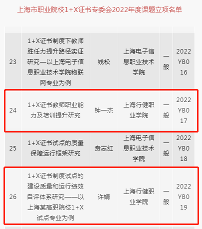 根据《上海市职业院校1+X证书制度试点专家委员会关于公布2022年度课题立项名单的通知》,学院经管系钟一杰老师和科发处许婧老师的课题均获批准立项。两位老师的课题聚焦1+X证书试点工作与学院人才培养融合过程中的热点、难点问题。此次立项进一步强化了学院教师对1+X证书工作的理解与思考,对进一步推动1+X试点工作落实落地具有积极的意义。(科发处)