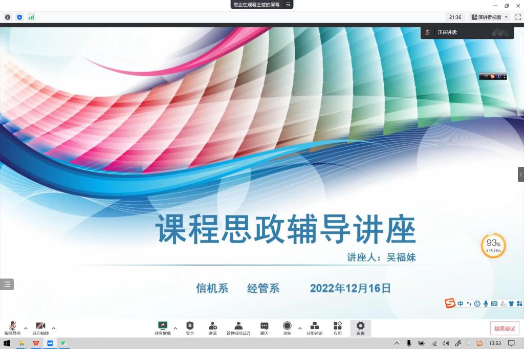 此次讲座主题鲜明,内容丰富,深入浅出,入脑入心,讲座结束后,信机系主任王莹、经管系副主任孙天慧分别代表学系感谢吴老师的分享,并指出宝贵的知识和经验分享为专任教师后续开展课程思政工作指明了方向和思路,也希望全体教师能够通过专题辅导,结合学科和课程的特点,从思政课程的核心思想出发,进一步挖掘和思考专业课程可以融入的思政元素和内容,落实“立德树人”,不断提高人才培养质量。(经管系、信机系)