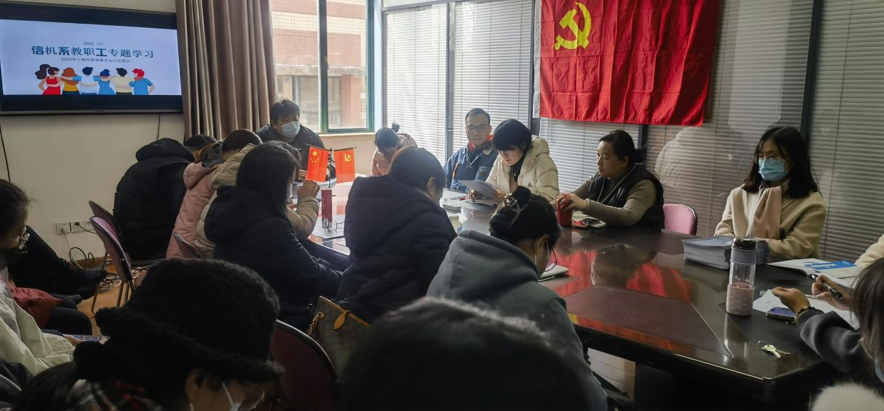会上,王永书记指出,2023年是贯彻党的二十大精神的开局之年,是深入实施上海市教育“十四五”规划的关键之年。《2023年上海市教育委员会工作要点》指出:上海教育工作要坚持以习近平新时代中国特色社会主义思想为指导,坚持深入学习贯彻落实党的二十大精神和习近平总书记考察上海重要讲话精神,认真贯彻落实习近平总书记关于教育的重要论述。王永书记带领信机系全体教师主要从以下几个方面进行了全面深入的学习:第一,落实立德树人根本任务,促进学生全面发展;第二,深化教育领域综合改革,推动高质量教育体系建设;第三,加大优质教育资源供给,促进基础教育优质均衡发展;第四,深化产教融合和校企合作,推进现代职业教育体系建设改革;第五,加快高校科技创新和“双一流”建设,推动高等教育高质量发展;第六,完善终身教育体系,推动高水平学习型社会建设等内容。