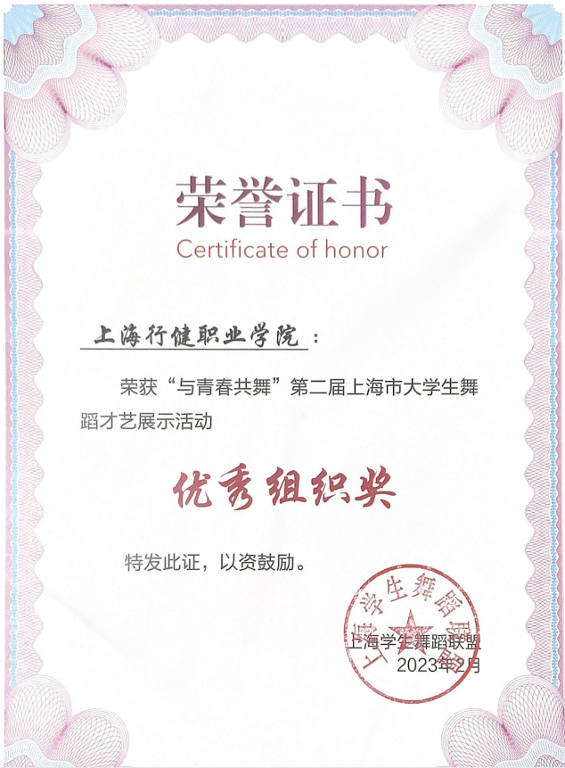 为贯彻《关于全面加强和改进新时代学校美育工作的意见》文件精神,落实《教育部关于切实加强新时代高等学校美育工作的意见》要求,展现当代青年大学生的时代风采,培养心灵美、形象美、语言美、行为美的新时代青年,上海学生舞蹈联盟在2022年6月-12月举办了“第二届上海市大学生舞蹈才艺展示活动”。学校高度重视、积极响应,动员组织各学系学生踊跃参加,最终2021级学前教育3班卢文文同学荣获“与青春共舞”第二届上海市大学生舞蹈才艺展示活动非专业组二等奖,学校荣获优秀组织奖。