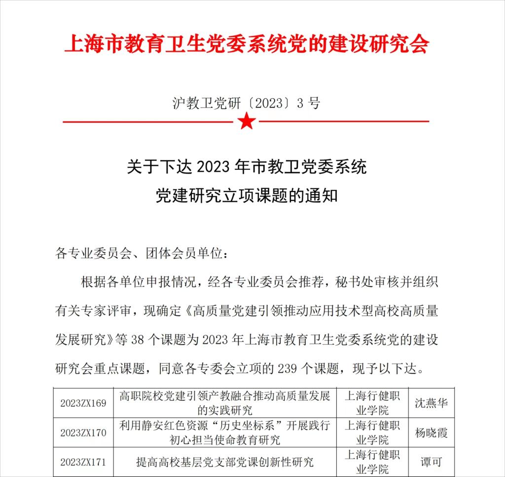 近日,上海市教育卫生党委系统党的建设研究会公布了2023年度党建研究课题立项情况,学校共有3项课题获得课题立项。
