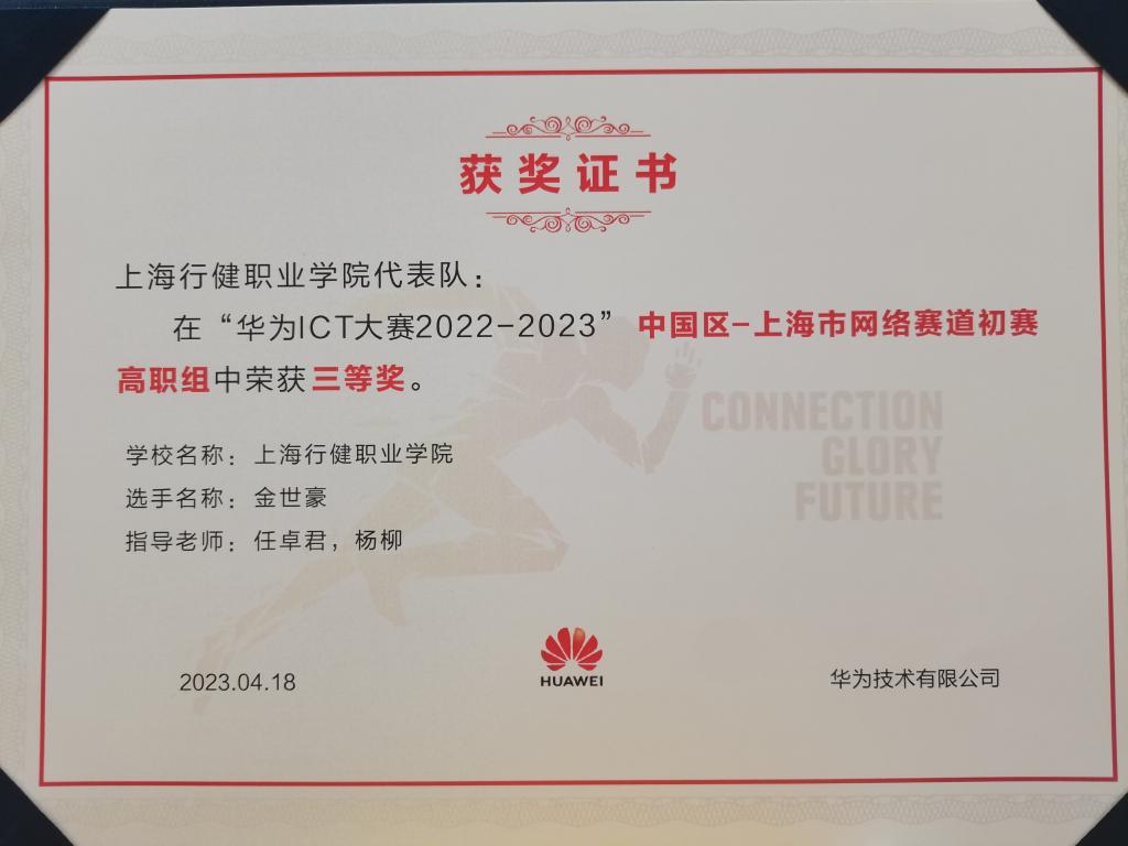 “华为ICT大赛”是华为公司面向全球大学生打造的ICT人才竞技交流赛事,是全国普通高校大学生竞赛排行榜内的重点竞赛项目之一。“华为ICT大赛2022-2023上海市赛”在上海市教委、上海市学生事务中心的指导和支持下,由华为技术有限公司主办,分为云赛道、计算赛道、网络赛道和创新赛道,共有28所高校的1200余名学生参与。4月18日,信机系计算机网络技术(中高职贯通)专业的金世豪同学荣获“网络赛道”三等奖并受邀参加了在上海电机学院举办的颁奖典礼。此次比赛有助于进一步推动信机系计算机网络技术专业“课-赛-创”人才培养模式改革。(信机系)