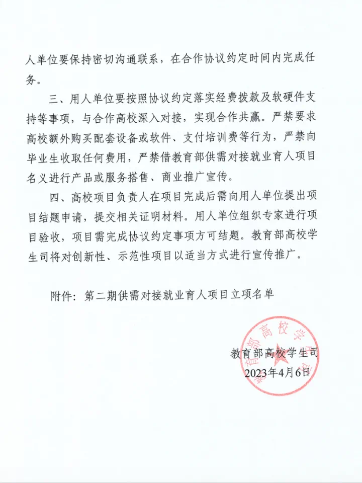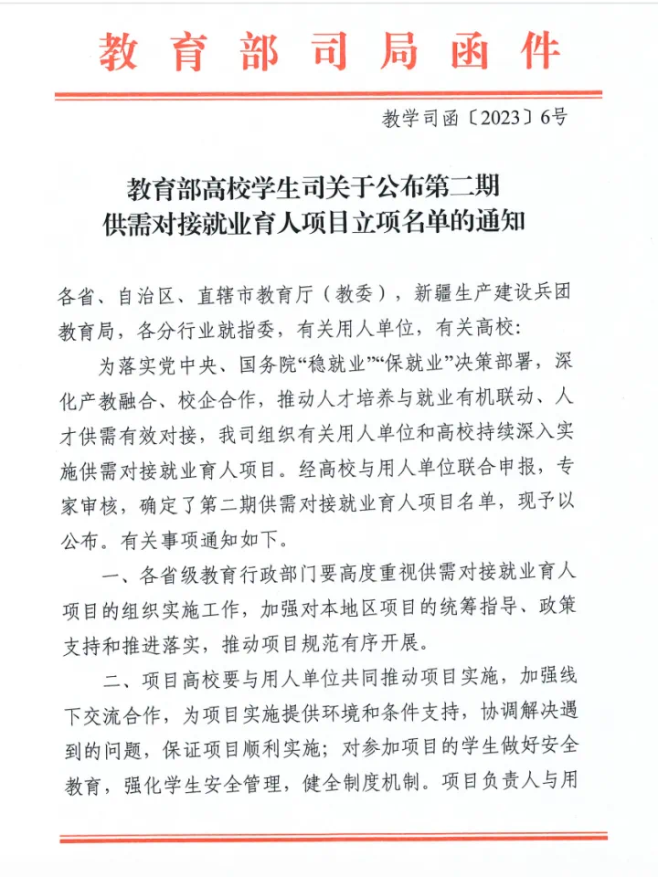 近日,教育部高校学生司印发《关于公布第二期供需对接就业育人项目立项名单的通知》(教学司函〔2023〕6号),我校经管系与金拱门(中国)有限公司成功申报并获批教育部供需对接就业育人项目。