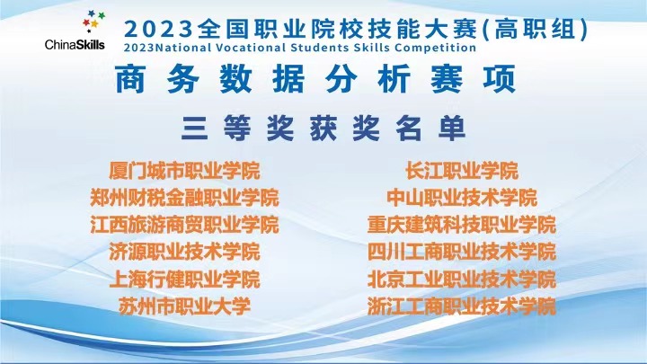 近日,2023年全国职业院校技能大赛——高职组商务数据分析赛项在山东省济南市顺利举行。上海行健职业学院参赛队坚持不懈、奋发进取,最终在商务数据分析赛项中获得全国三等奖的好成绩。