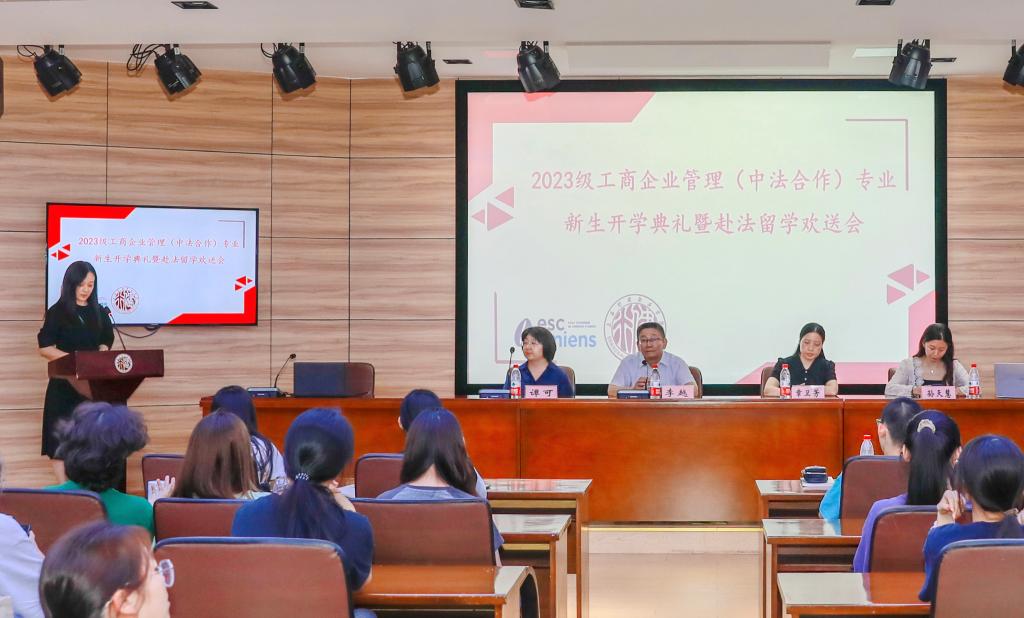 9月6日下午,数字商贸学院工商企业管理(中法合作)专业举行2023级新生开学典礼暨赴法留学欢送会。学校党委副书记李越、副校长章卫芳,商贸学院党支部书记谭可、商贸学院院长孙天慧以及中法专业组教师出席开学典礼。典礼由中法专业主任丁玲主持。