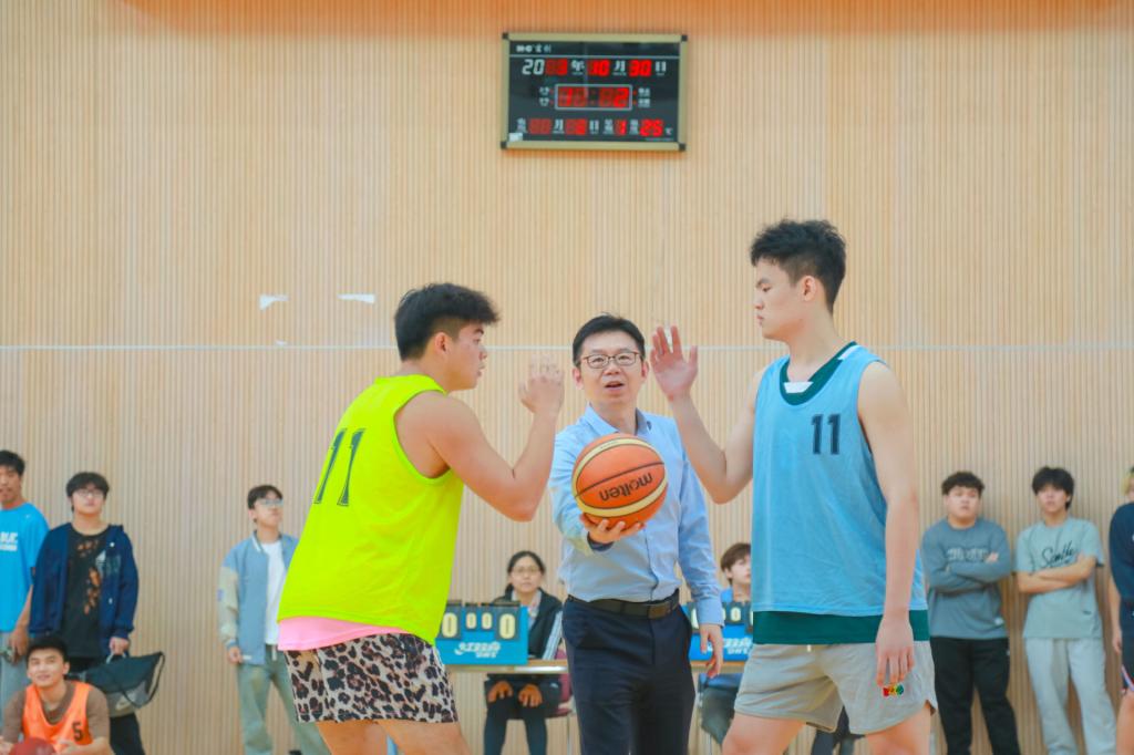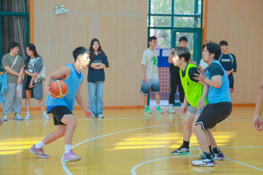 比赛首日,学校校长黄群为双方队员开球,随着裁判的哨响,整个球场充满了紧张的气氛。比赛进程中,各位队员全力以赴,越战越勇,显示了他们极佳的心理素质和运动素养。在场同学也情绪高涨、摇旗呐喊,不时为队员打气、喝彩,气氛热烈。赛场上各队拼抢激烈,带球、运球、投篮等一系列动作潇洒、规范,引来围观老师、同学一阵阵喝彩。