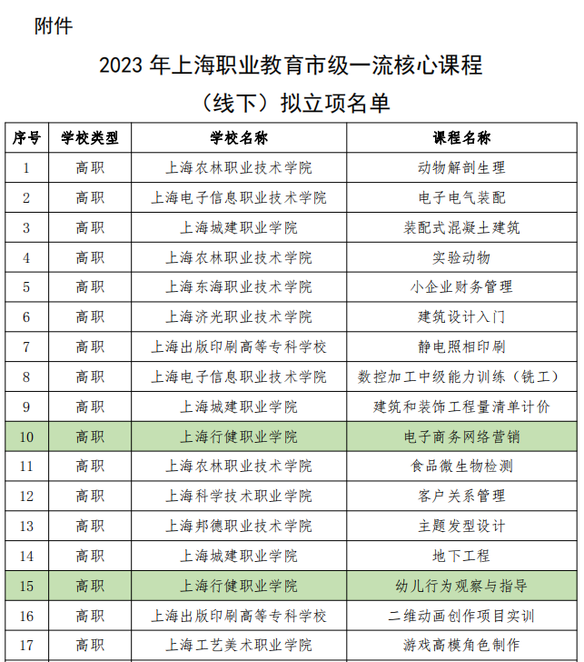 根据《教育部关于加快推进现代职业教育体系建设改革重点任务的通知》(教职成厅函〔2023〕20号)《2023年职业教育一流核心课程建设指南》及上海市教育委员会《关于落实教育部近期重点任务的工作提示》要求,经过学校申报、专家评审、线上公示等程序,我校数字商贸学院孙天慧老师团队的《电子商务网络营销》课程和儿童发展与教育学院王烨芳老师团队的《幼儿行为观察与指导》课程入选2023年上海市职业教育市级一流核心课程(线下)。