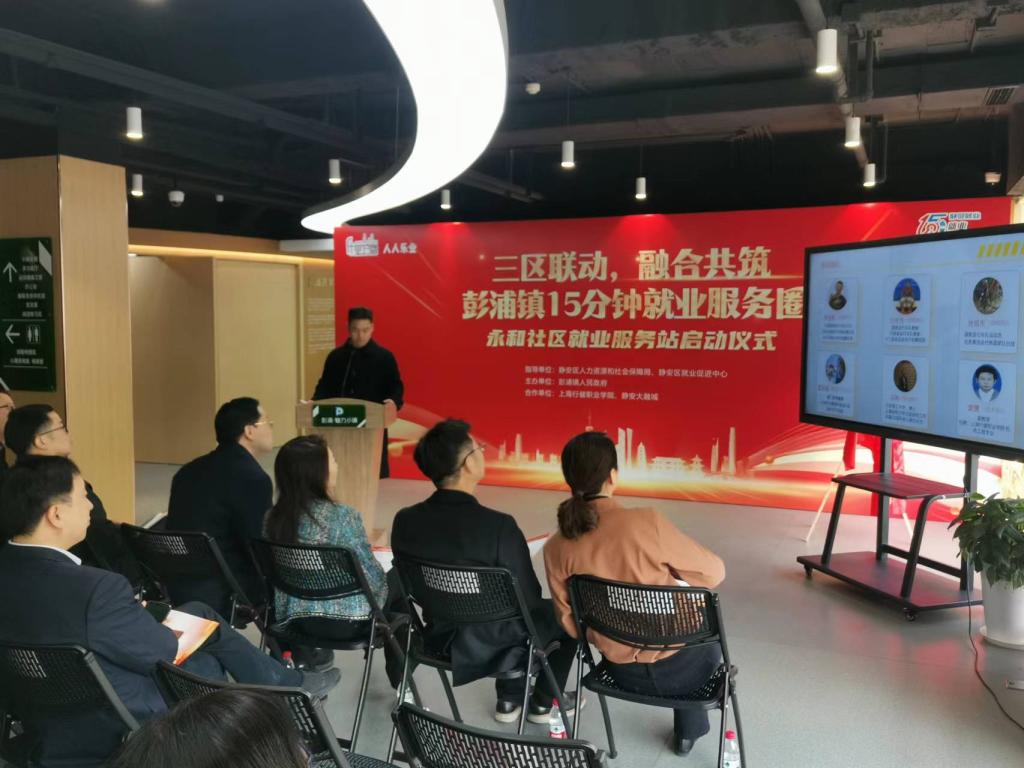 彭浦镇党委副书记、镇长何涛为本次活动致辞,提出了全面服务区域青年就业的要求,并与我校校长黄群、光大安石商业事业部上海区域总经理翟云渊共同签署“三区联动”彭浦镇15分钟就业服务圈合作协议。相关区、镇领导为彭浦镇永和社区就业服务站揭牌。