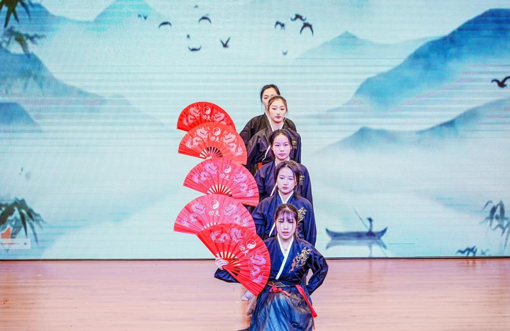 舞蹈表演《功夫扇》拉开了闭幕式序幕,舞者们手持功夫扇时而轻盈舒展,时而刚劲有力,展现出武术动作与中国功夫的巧妙结合。