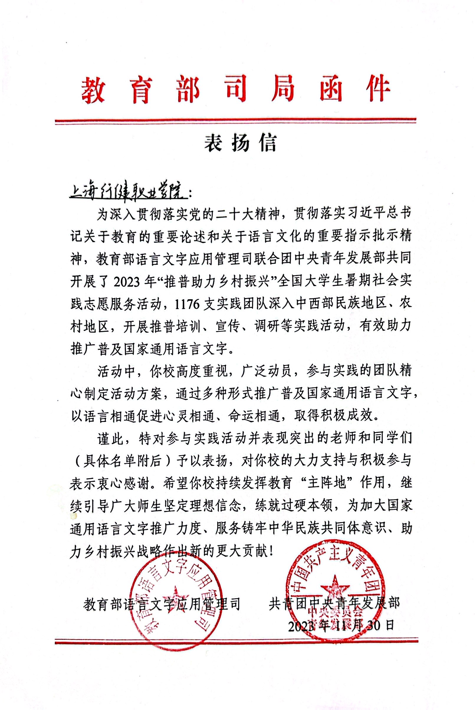 在历经7个月的材料提交和专家评审后,团队在1176支全国大学生社会实践团队中脱颖而出,获得了2023年“推普助力乡村振兴”全国大学生暑期社会实践专项“优秀实践团队”。教育部语言文字应用管理司和共青团中央青年发展部特发来表扬信,对参与实践活动并表现突出的老师和同学们予以表扬,对我校的大力支持与积极参与表示衷心感谢。