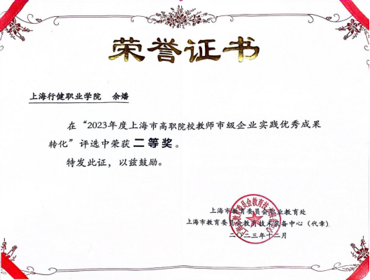 近日,2023年度上海市高职院校教师市级企业实践优秀成果转化评选活动结果出炉,外语外贸学院余燔老师荣获二等奖。