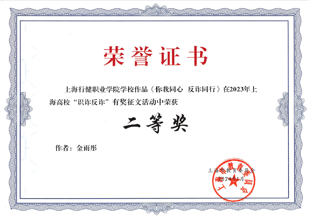 为深入贯彻落实习近平总书记对打击治理电信网络诈骗违法犯罪工作的重要指示批示精神,不断增强学校反诈工作针对性,全面筑牢学校反诈工作防火墙,有效维护本校师生财产安全,我校组织动员全体在校生积极参加市教委会同相关单位组织开展的2023年上海市高校“识诈反诈”系列宣传活动,并喜获两个二等奖,其中教育学院施伟荣老师指导的22级中高职贯通1班金雨彤同学的征文作品《你我同心 反诈同行》在2023年上海高校“识诈反诈”有奖征文活动中荣获二等奖;创意学院陈盐青老师指导的23级广告1班沈梦圆等同学的短视频作品《不好 有诈》在2023年上海高校“识诈反诈”校园宣传达人选拔大赛中荣获二等奖。