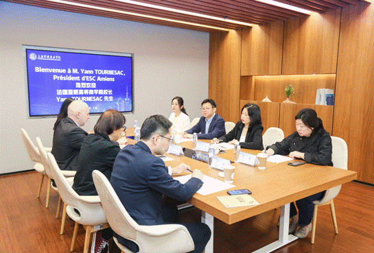 在欢迎仪式上,黄群校长代表学校向远道而来的法国院长一行表示了热烈欢迎,并简要介绍了近几年学校的新发展、师生取得的重大赛事奖项与荣誉以及国际交流等方面的成绩。他强调,学校一直高度重视国际交流与合作,致力于为学生提供更广阔的国际视野和更丰富的教育资源。Yann TOURNESAC院长对我校的热情接待表示感谢,并详细介绍了亚眠高等商学院的教育理念、特色课程以及在国际教育领域取得的进步。他表示,法国亚眠高等商学院非常愿意与上海行健职业学院开展多层次、多领域的合作,有信心通过双方的努力共同推动两校交流合作事业的进一步发展。章卫芳副校长就两校师生互访、双师培养、引入国外职业资格证书等事宜与法方院长进行了深入探讨。双方一直认为,通过互相学习与借鉴,可以推动两校之间在教学、科研、人才培养等方面的共同进步,为培养具有国际视野和创新精神的高素质人才贡献力量。数字商贸学院院长孙天慧向Yann TOURNESAC先生介绍了数字商贸学院在促进教师专业水平发展、增强学生英语运用能力等方面的努力,商贸学院人才培养质量和国际化水平得到进一步提升。