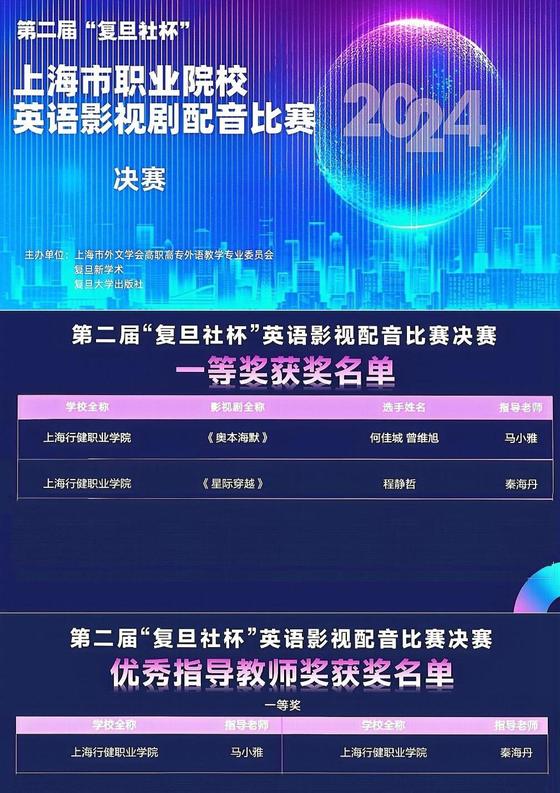 我校基础教育学院英语教研室全体教师动员学生积极参赛。4月下旬,基础教育学院英语教研室组织校内初赛,累计收集21份作品。经过教研室评选,最终推选出23学前教育婴托专业何佳城同学与23机电专业曾维旭同学的双人配音作品《奥本海默》和23网络专业程静哲同学的单人配音作品《星际穿越》两个作品参加上海市复赛。备赛期间,马小雅老师和秦海丹老师在把握参赛作品内容及思想的基础上,对学生语言的准确性和流利度、情感表达的契合度等配音技巧进行指导。复赛中,两个作品从全市六十多个作品中脱颖而出,顺利进入决赛。决赛现场,何佳城、曾维旭、程静哲三位同学稳定发挥,通过精湛的配音技巧,将原片中的情感与氛围完美呈现,最终2组选手双双取得一等奖的好成绩,展示了行健学子良好的专业素质和精神风貌。(基础学院)