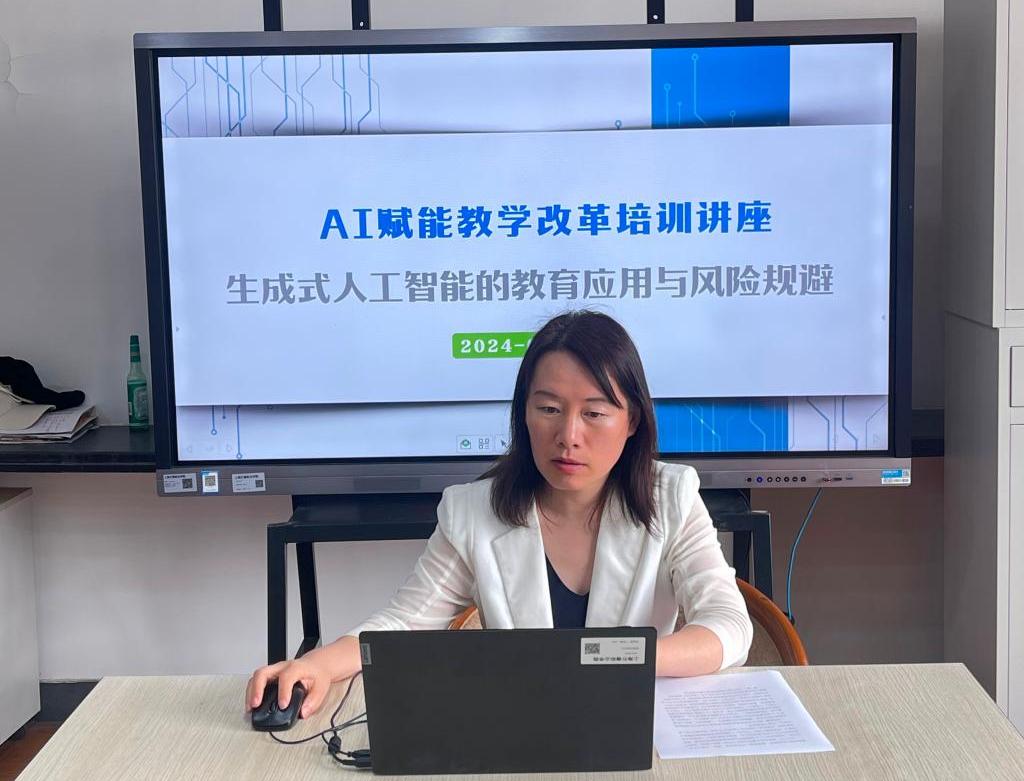 为更好应对人工智能给职业教育带来的挑战和机遇,提升对人工智能+教育的认识,增强教师决策规划及人工智能技术应用能力,6月14日下午,学校教务处、科发处邀请江苏师范大学教授、博士生导师杨现民教授带来以“生成式人工智能的教育应用与风险规避”为主题的培训讲座。讲座由科发处处长杜君英主持,二级学院任课教师共同聆听了杨教授的精彩讲座。