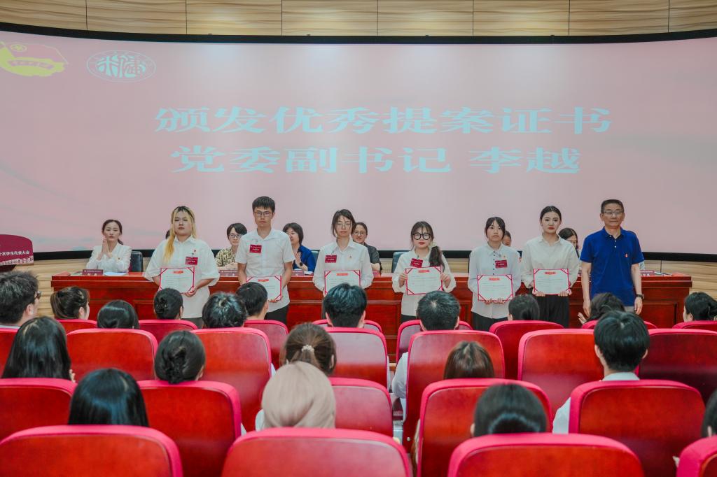 学校学生兼职团委副书记智慧同学作提案工作报告。本次学代会共收到来自全校5个二级学院的59份提案,主要聚焦教育教学、生活服务、权益维护等方面的建议,在广泛调研的基础上,引导学生充分发挥主体作用,切实为同学做好事、办实事、解难事,共同为推动学校发展建言献策。《关于加强培养创院学子艺术素养的提案》《关于解决宿舍内衣物晾晒问题的提案》等六个提案获上海行健职业学院第十次代表大会优秀提案奖,学校党委副书记李越为优秀提案代表颁奖。