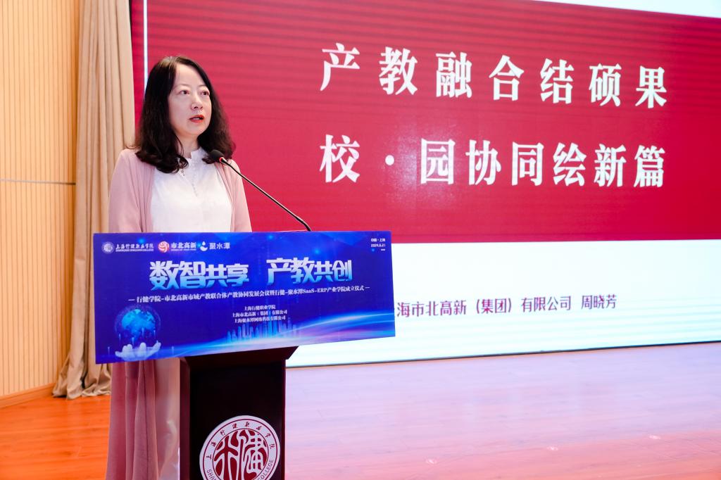 上海市北高新(集团)有限公司副总裁、上海市北高新园区产教联合体理事长单位代表周晓芳指出,上海市北高新园区产教联合体是上海市首批14家“上海市市域产教联合体”之一,这不仅彰显了上海市对市北高新技术服务业园区的高度认可,更是对园区产业迅猛发展的深切关怀和厚爱。周晓芳以“产教融合结硕果,校·园协同绘新篇”为题向与会嘉宾回顾联合体建设前期工作,并发布重点任务。未来,联合体将瞄准建设目标,紧紧围绕对标建设指标创新机制研究,协同产教合力优化育人路径,加强智库建设促进成果转化,推动产学研用提升品牌影响,实现“校政行企”协同破解产教融合机制性障碍难题,让各方在深化产教融合中都能获益,推动产教融合持续向纵深发展。与上海行健职业学院携手推进校企师资互聘共育、实训课程及资源建设、创新实验室建设和学生就创业项目建设,以“供给—需求—供给”的闭环反馈打造不同知识技能层次和专业岗位的数智人才队伍,动态推进区域内“产学研用”一体化发展,打造区域经济“新引擎”。