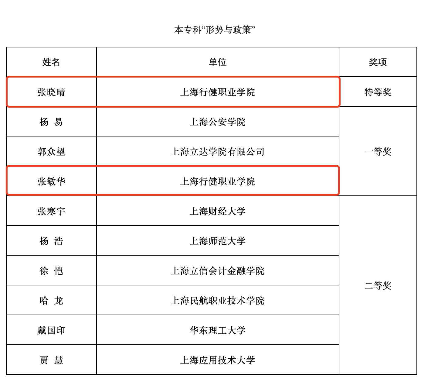 近日,“讲台上的新思想”——2024年上海高校思政课教师教学大比武暨教学展示活动获奖名单公示,我校马院参赛教师取得佳绩。根据《中共上海市教育卫生工作委员会上海市教育委员会关于开展“讲台上的新思想”——2024年上海高校思政课教师教学大比武暨教学展示活动的通知》(沪教委德〔2024〕21号)要求,学校领导高度重视,马院积极动员、精心组织,扎实开展校内初赛,深入开展研讨辅导。经学校申报、材料审核、专家评审、现场展示等环节,共有3位教师入围决赛,并在本专科“形势与政策”教学展示中,与本科院校同台竞技,张晓晴斩获特等奖,张敏华获一等奖。此外,盛红、张晓晴、张敏华3位老师的教案入选精彩教学讲义名单。我校获本次比赛的优秀组织奖。