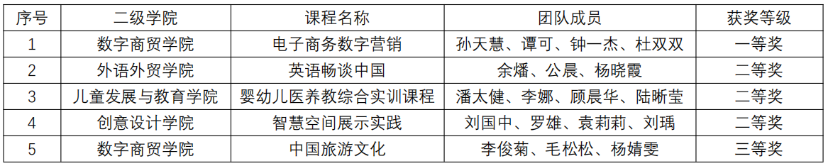 孙天慧、谭可、钟一杰、杜双双的《电子商务数字营销》课程教学团队依托真实项目,强化校企双元、双向融入,有机融合线上和线下平台资源,全面构建思政培育的浸润环境;余燔、公晨、杨晓霞的《英语畅谈中国》课程教学团队以文化打造引领学习情境,用生动的案例和有趣的互动展现中国文化的深厚底蕴,体现英语教学的创新与实践;潘太健、李娜、顾晨华、陆晰莹的《婴幼儿医养教综合实训课程》教学团队强调实践与理论相结合,紧密围绕婴幼儿的生理、心理发展特点,遵循技能学习规律,实现螺旋上升教学目标;刘国中、罗雄、袁莉莉、刘瑀的《智慧空间展示实践》课程教学团队以前沿教学理念为引领,积极融入最新科技与设计理念,探索适应行业发展需求的教学新生态;李俊菊、毛松松、杨婧雯的《中国旅游文化》课程教学团队以大思政体系为基础,数字化赋能职业教育典型教学模式应用,打造叙事+沉浸式旅游课堂。