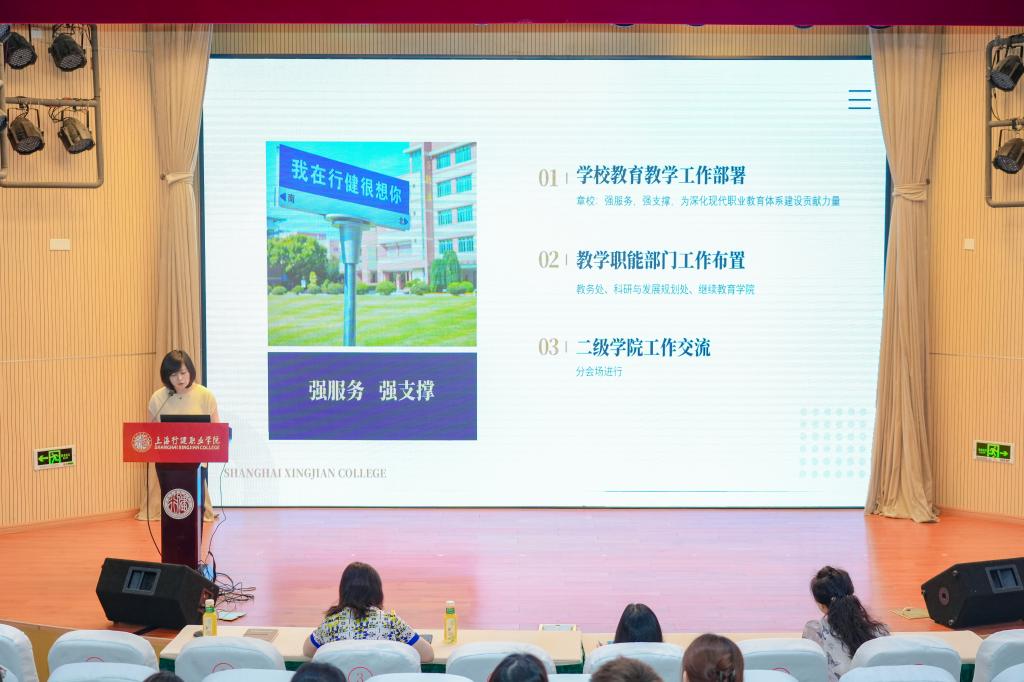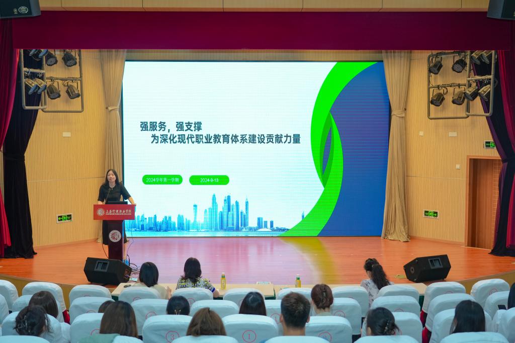 随后,她从做实“一体”,建强“两翼”、办好三件大事、打通“四链”、打造“五金”进行新学期工作思路解读。她提出要将“五金”建设(金专、金课、金师、金地、金教材)作为新学期的工作抓手,从多个维度推进教学内涵建设。她强调,要建设高质量的专业群,打造精品课程,优化师资队伍结构,深化校企合作,建设高质量的实训基地,编撰具有创新性和实用性的教材,持续优化人才培养模式,积极抢抓改革机遇,全面提升教育教学水平,进一步实现教学内涵新提升,推动学校新学年的教学工作取得新的突破。