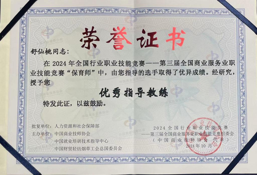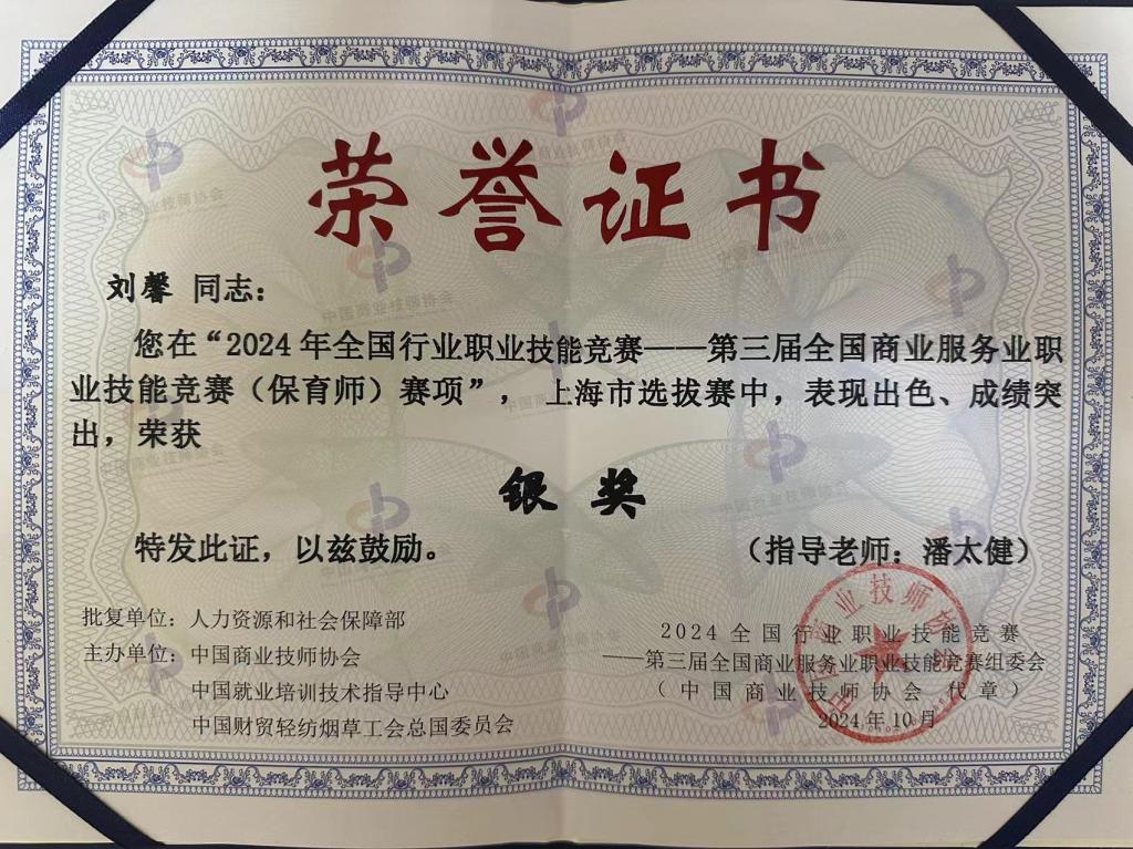 10月25日,第三届全国商业服务业职业技能竞赛(保育师)上海市选拔赛在中华职业学校隆重举行。我校教育学院精心组建指导团队,由舒仙桃老师领衔,潘太健、顾晨华老师共同协助,教育学院2024级学前教育(中高贯通)3班薛雨晴和2023学前教育(中高贯通)3班的刘馨两位同学参赛,斩获一金一银的好成绩,舒仙桃老师荣获优秀指导教练称号。