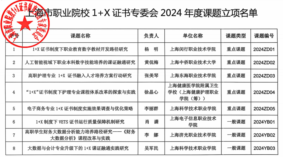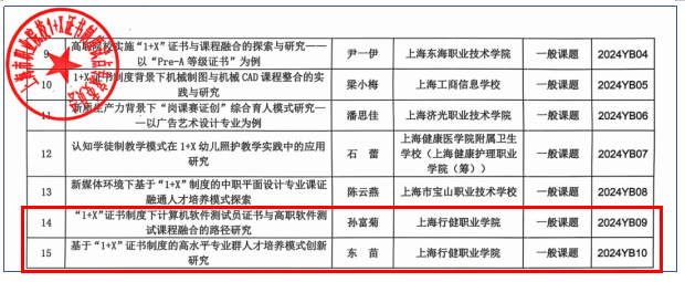 近日,上海市职业院校1+X证书制度试点专家委员会公布了2024年度课题立项名单,我校信息学院孙富菊老师的“‘1+X’证书制度下计算机软件测试员证书与高职软件测试课程融合的路径研究”和东苗老师的“基于‘1+X’证书制度的高水平专业群人才培养模式创新研究”两个课题成功获得立项。