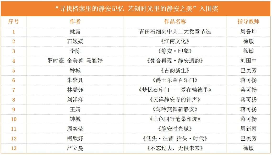 12月11日,由上海市静安区档案局、中共上海市静安区教育工作委员会、上海市静安区教育局主办,上海市静安区档案馆承办的“寻找档案里的静安记忆 艺创时光里的静安之美——静安区档案德育成果展示交流会”隆重举行。我校受邀在交流会上做主题汇报和展演,3件学生作品获“评委会特别奖”,13件学生作品获“入围奖”,学校荣获优秀组织奖。