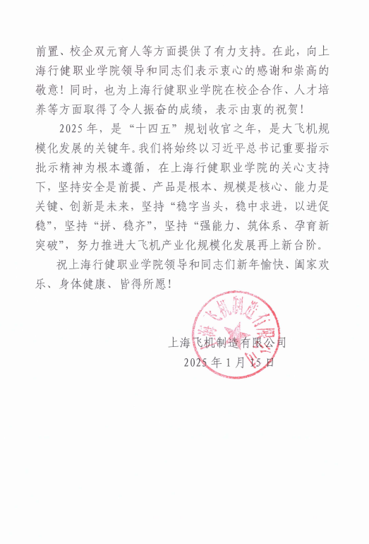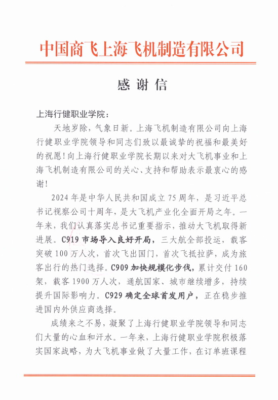 2025年初春,中国商飞上海飞机制造有限公司向上海行健职业学院发来感谢信,对学校在大飞机事业发展中的支持与帮助表示诚挚谢意,并对学校取得的成就表示热烈祝贺。