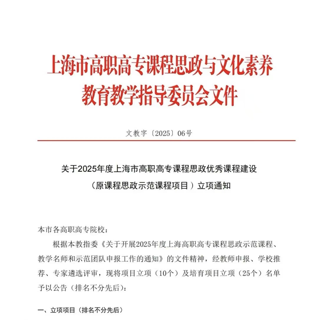 “上海市高职高专课程思政优秀课程建设项目”是市级课程思政建设的标杆项目,旨在选树一批将价值塑造、知识传授与能力培养紧密结合的示范课程。此次两门课程入选,是我校深入推进“课程思政”建设、落实立德树人根本任务取得的又一标志性成果。这一成果不仅是对授课教师团队教学理念与实践创新的高度肯定,更彰显了我校在教育教学改革中的积极探索与实践,是对我校长期以来坚持“三全育人”、深化“德技并修”育人模式的权威认可。