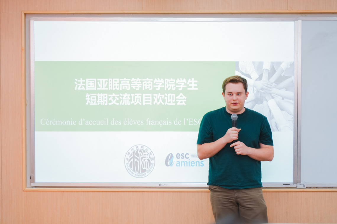 欢迎会伊始,上海行健职业学院教务处处长公晨致欢迎辞。代表学院对法国亚眠高等商学院师生的到来表示热烈欢迎,并强调国际交流是提升学生国际视野和跨文化能力的重要途径。表示,学生交流项目为两校师生搭建互动平台,助力培养具有全球竞争力的复合型人才。希望通过师生交流深化双方在学术、文化等领域的合作,为学生创造更多实践与成长机会。随后,法国亚眠高商中国区代表严威发表讲话。他回顾了两校长期以来的合作成果,并对本次短期交流项目充满期待。上海行健职业学院数字商贸学院商贸管理群主任钟一杰介绍了数字商贸学院商贸管理群的教学特色及中法合作项目的成果。他表示,数字商贸学院商贸管理群未来将持续优化课程体系,为国际化商科人才培养注入新动能。