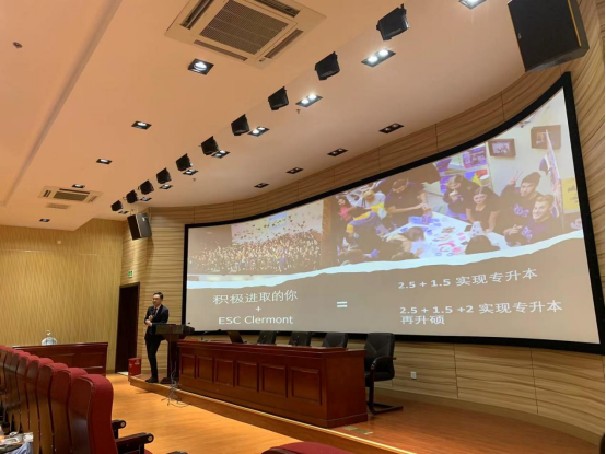 为推进国际交流,提升人才培养质量,近日,外语外贸学院联合数字商贸学院,与合作院校法国克莱蒙高等商学院开展留学与升学专题宣讲会以及后续推进会。宣讲会在2113教室举行,外语外贸学院院长曾恬、书记杨晓霞、数字商贸学院升学与就业指导老师杜双双、法国克莱蒙高等商学院中国地区招生总负责人严威老师、外语外贸学院负责教师及辅导员出席本次宣讲会,2021级、2022级学生积极参与。