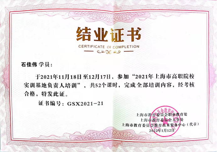 今年年初,“2021年上海市高职院校实训基地负责人培训”结业式圆满落幕。信机系石佳伟老师参加了此次培训,培训于上海市教育委员会教育技术装备中心举行。培训内容主要包括信息化技术在实训管理与教学中的应用、宏观财政政策解读、产教融合型实训基地研讨等,培训采取线上与线下结合的方式开展,通过一系列的理论学习、案例分析、校企参观和交流学习,帮助学员进一步了解信息化技术在实训室管理和平时教学应用中的重要性,提供了解决高职实训基地管理、教学、建设等相关问题的思路。此次培训为加强学院实训基地管理队伍专业化水平提供助力,为高素质技能人才培养提供保障。(信机系)