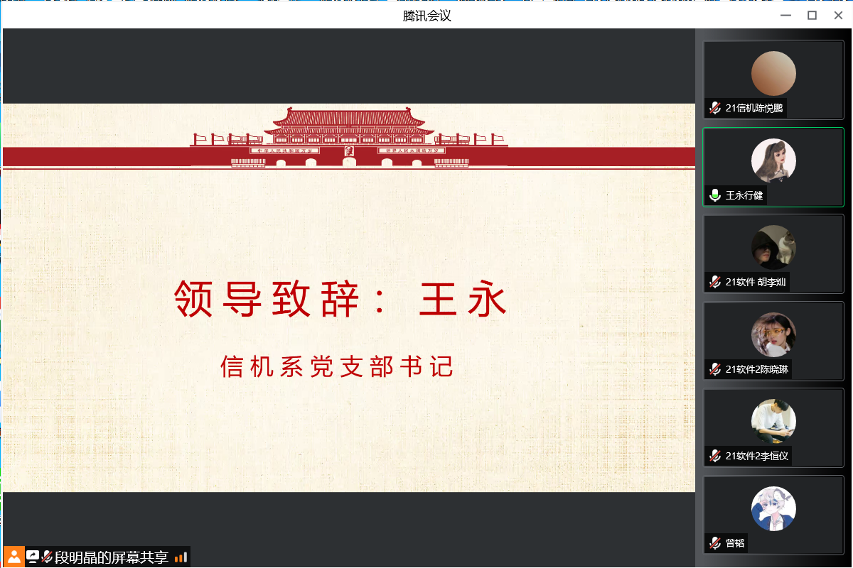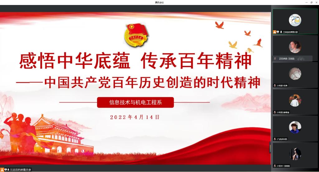 4月14日,信机系以“感悟中华底蕴,传承百年精神——中国共产党百年历史创造的时代精神”为主题开展线上团员培训课程,信机系第十九期团员培训班41名学员参加了本次会议,本次会议由信机系团总支副书记王喆芸同学主持。
