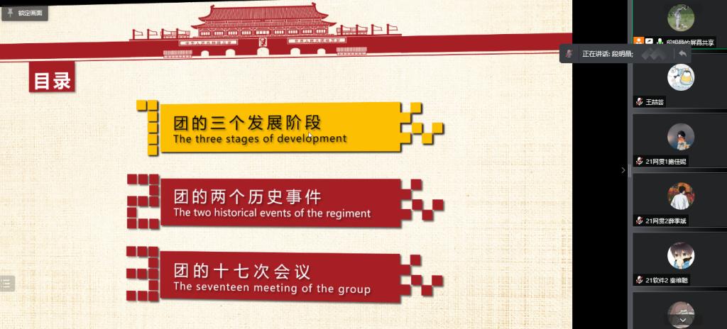 随后,段明晶同学分别介绍了共青团的三个发展阶段、共青团的两大重大历史事件,以及简述了共青团的十七次会议,引导大家知古鉴今、学史明志。