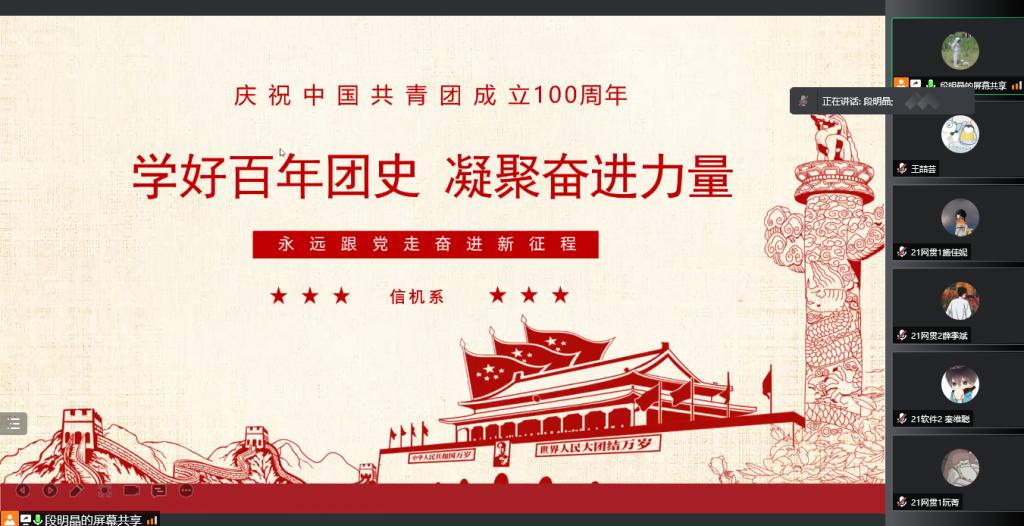 4月13日,信机系于线上组织开展以“庆祝建团百年——学好百年团史,凝聚奋进力量”为主题的团员培训课程。信机系党支部书记王永老师、信机系团总支书记庄淑珺老师、信机系第十九期团员培训班41名学员参加了本次会议。本次会议由信机系团学会副主席段明晶同学主持。