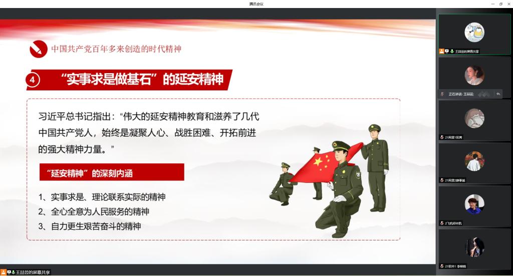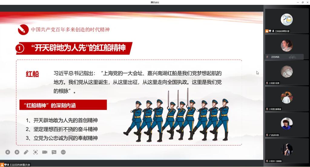 在本次课程中,王喆芸同学系统介绍了中国共产党百年里创造的各种时代精神,包括:红船精神、井冈山精神、长征精神、延安精神、西柏坡精神、建国精神、“两弹一星”的奋斗精神、“改革开放闯新路”的深圳精神以及伟大抗疫精神。